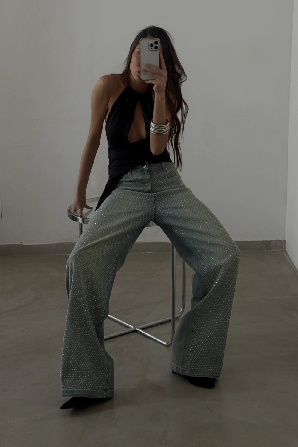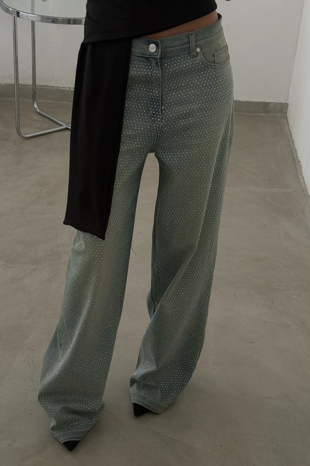 Jean corte wide leg de tiro alto confeccionado en denim elastizado. Presenta diseño clásico, y avios n metálicos en color plateado. El lavado matizado aporta un efecto visual moderno, mientras que los strass multicolores distribuidos en la parte posterior le añaden el toque distintivo a este denim.