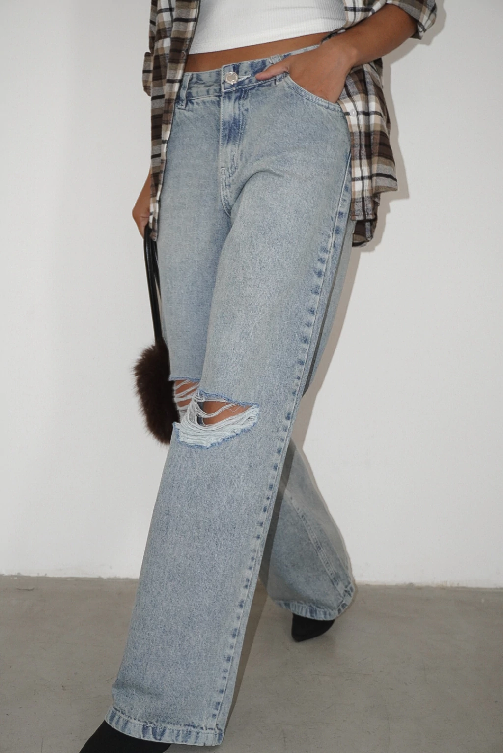 Jean de corte wide leg con calce relajado y tiro medio, confeccionado en denim celeste con lavado desgastado. Presenta roturas en ambas rodillas que le aportan un estilo urbano y descontracturado. Ideal para looks cancheros y cómodos.